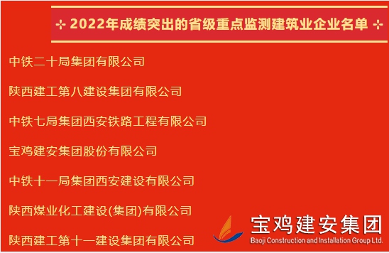 近日,陜西省建筑業(yè)協(xié)會發(fā)出通知,對全省26家“成績突出的省級重點(diǎn)監(jiān)測建筑業(yè)企業(yè)”進(jìn)行通報嘉獎,寶雞建安集團(tuán)股份有限公司榜上有名。