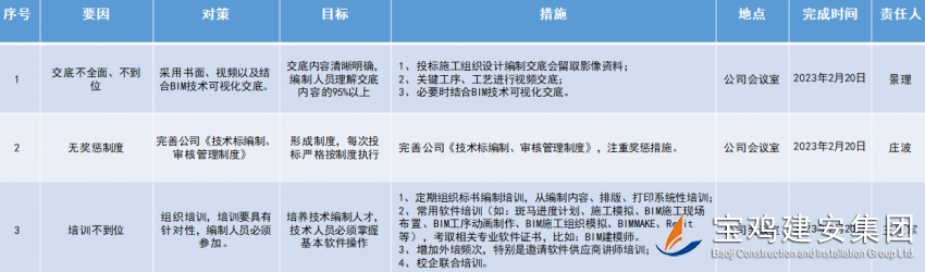 通過整理近年全公司投標(biāo)施工組織設(shè)計編寫情況,對投標(biāo)施工組織設(shè)計審核結(jié)論進行分析、統(tǒng)計、總結(jié)。根據(jù)排列圖分析,影響標(biāo)書審核得分的關(guān)鍵因素是“投標(biāo)施工組織設(shè)計內(nèi)容針對性不強”,“項目部、分公司投標(biāo)負責(zé)人或組織人員缺乏系統(tǒng)性部署”其累計頻率已達到77.77%,是主要解決的問題。經(jīng)過討論、分析,按照PDCA原則,最后制定了相應(yīng)實施對策與措施,落實責(zé)任人和完成時間,對策表見下圖: